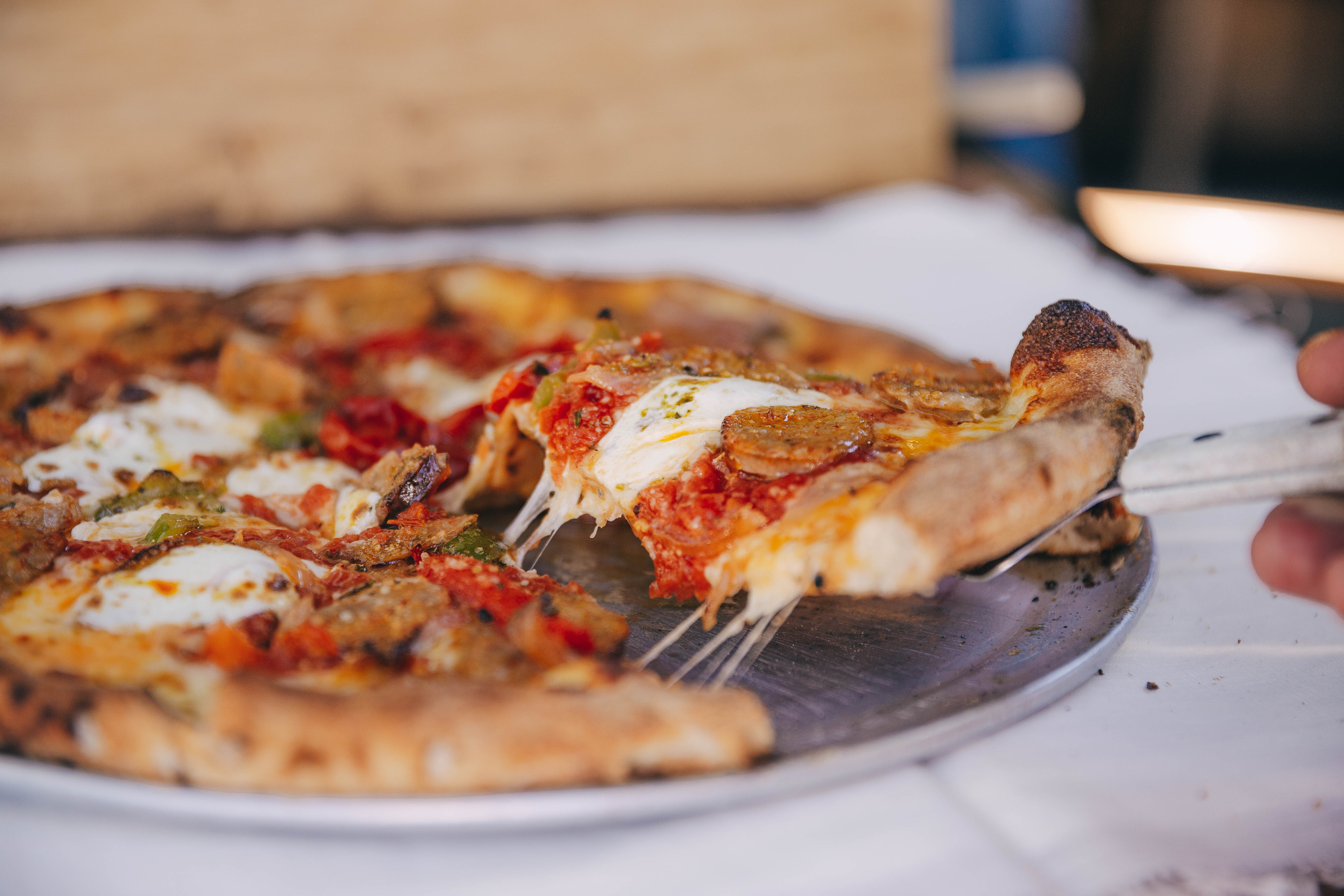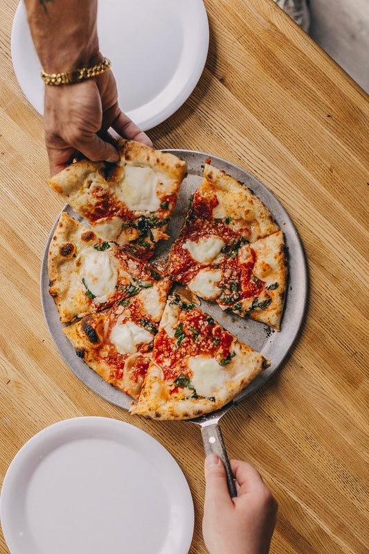 Our Neapolitan pizzas are about 13” in size, traditionally eaten with a knife and fork. One of the defining characteristics of Neapolitan pizza is that there is more sauce than cheese. This leaves the middle of the pie wet or soggy, so it is not conducive to being served by the slice. If you like a crispier pizza, try one of our options without San Marzano tomato sauce or get the Stromboli or Calzone!